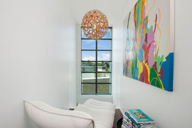 On the middle level are two bedrooms and a bathroom with dual access from the hallway and the master bedroom. An inviting reading nook in the mezzanine is a delightful feature which is enhanced by bespoke timber shelving.