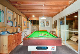 The lower level is quite self contained, with an extra large double bedroom, separate bathroom, next to this is a second living family area that is currently set up as a pool room (pool table staying) This area has a separate toilet.
